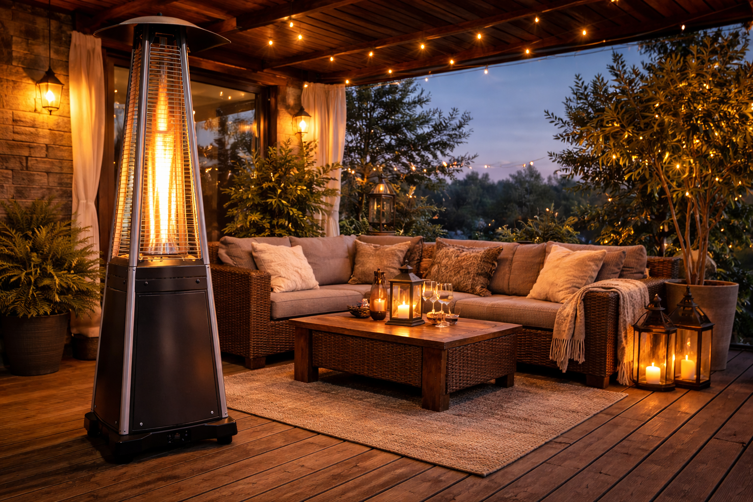 Zastosowanie profesjonalnego źródła ciepła eliminuje konieczność budowy stałych przeszkleń czy ciężkich konstrukcji osłonowych. Taras pozostaje otwarty, lekki wizualnie, a jednocześnie funkcjonalny w chłodniejsze dni.